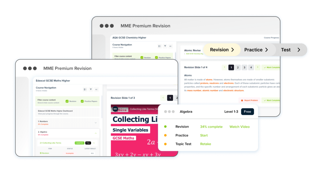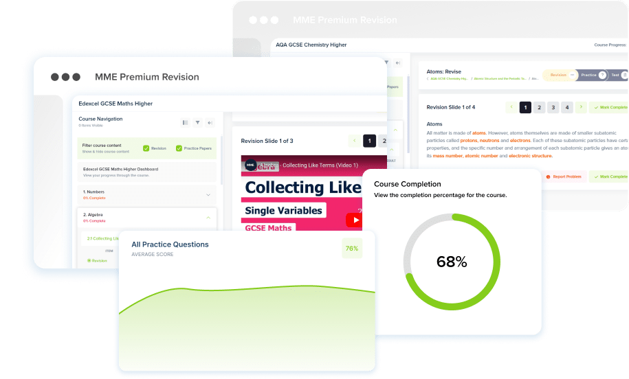 Learn entire GCSE maths, English and science courses online with our comprehensive MME Premium learning platform. With revision videos and notes, practice questions, topic tests, and mock exams for every topic on every course, MME Premium provides you with everything you need to prepare for your GCSE exams.