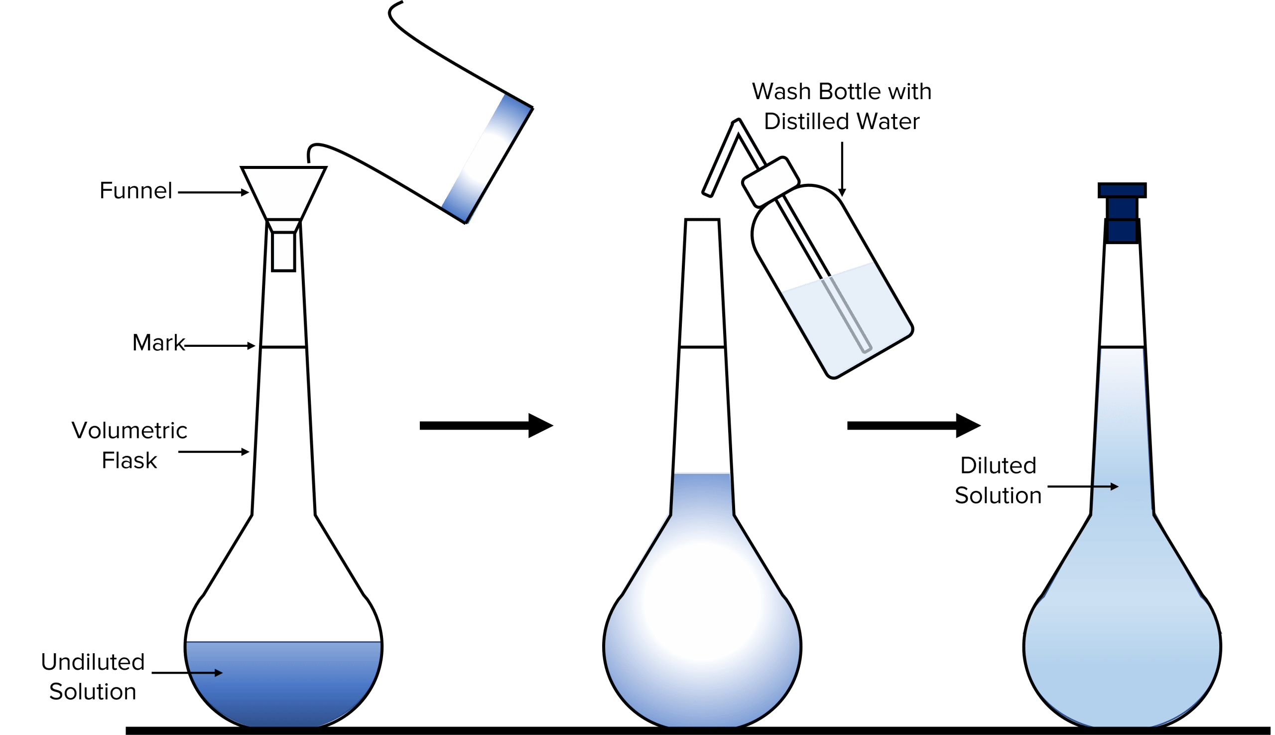 - Fill the rest of the flask (up to the mark) with distilled water. Use a dropping pipette for the last few drops.