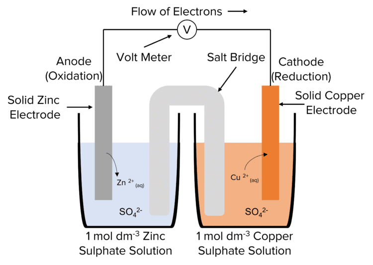 As this process continues, the mass of the anode will decrease as the metal is oxidised into solution. The mass of the cathode will increase as positive metal ions are reduced to solid metal. These reactions will eventually stop as the reactants are used up. At this point, as no more electrons are produced to move around the circuit, the cell voltage drops to 0.