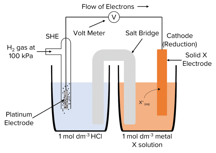 The potential of a half cell can only be measured by combining it with another half cell as it is not possible to measure the cell potential of a lone half cell. This allows us to find out which half cells are more or less negative than others, but does not give us any individual values. To do this we use a special half cell called the Standard Hydrogen Electrode (SHE).