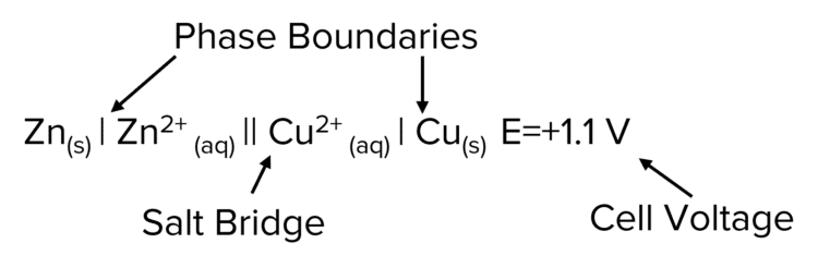Conventional cell representation is used to represent electrochemical cells in a simplified way. Below is an example of a conventional cell representation.