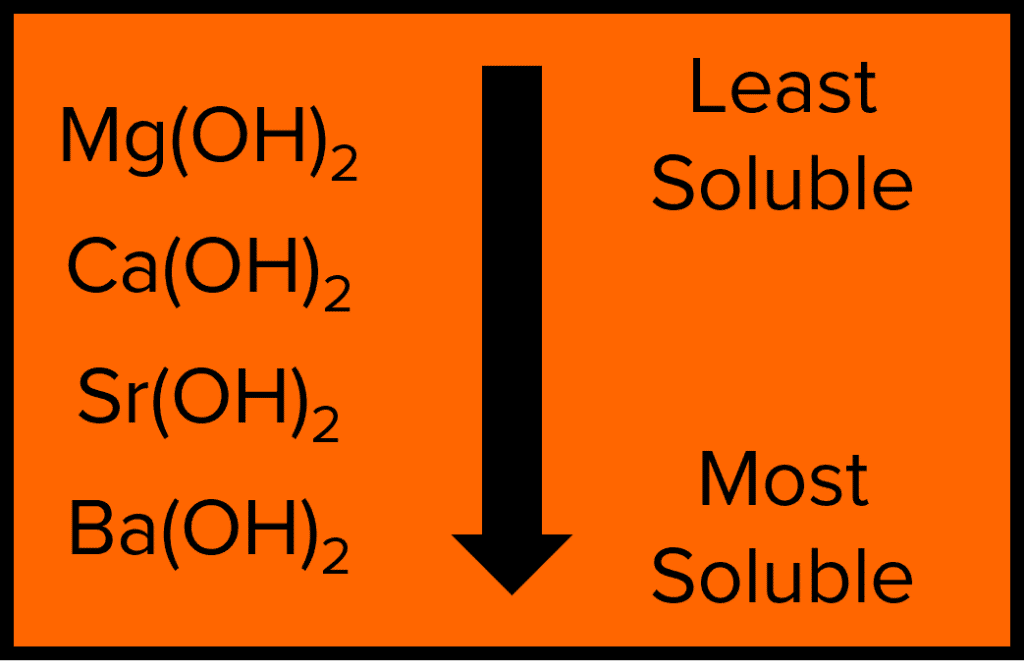 The Group 2 elements are able to form metal hydroxides when reacting with water. These hydroxides display a trend in their solubility in water. The solubility of the Group 2 Metal hydroxides increases as as we go down the group from magnesium to barium. The solubility of these hydroxides increases due to the increasing radius of the metal cations.