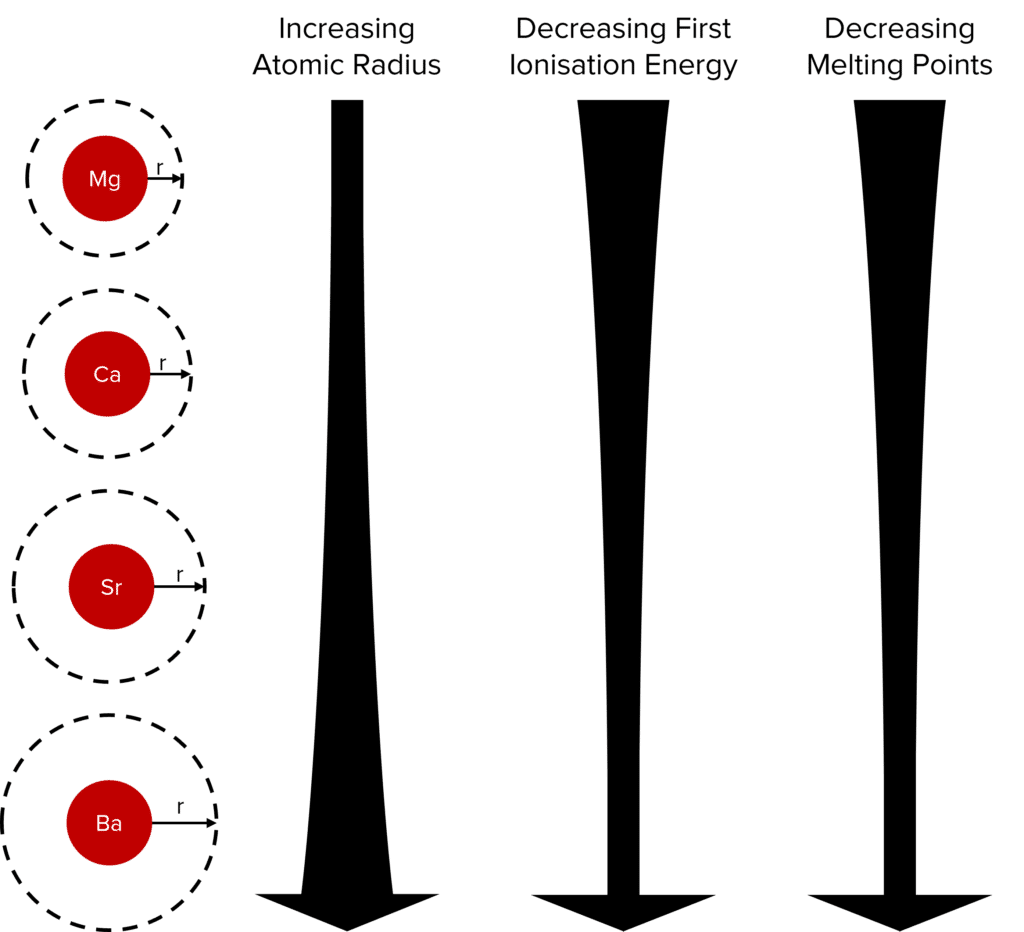 First ionisation energy decreases down the group because the outermost electrons are further from the nucleus, so less energy is required for an electron to be removed. There is also increased shielding going down group 2 which decreases the attraction of the outer electron to the nucleus.