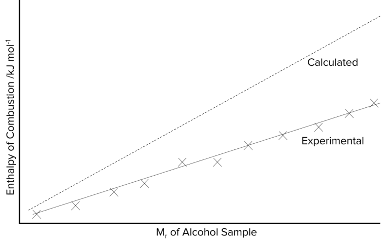 The values calculated from theory (e.g. by using Hess cycles) for the enthalpy of combustion for a carbon chain will typically be much higher than those determined from experiments. The discrepancy between the two will increase as chain length increases. This is a result of both heat loss during the experiment, as well as of incomplete combustion of the carbon chains. The likelihood of incomplete combustion will increase with chain length due higher the volumes of oxygen needed to completely burn longer chains. This accounts for the increase in the discrepancies between theoretical and experimental data.