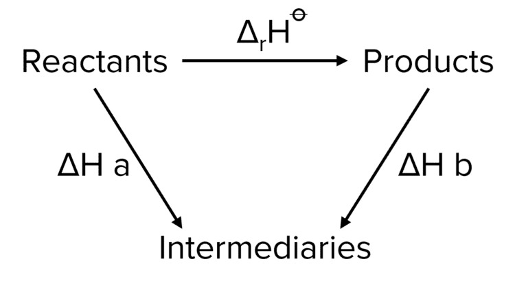 For many chemical processes, it is not possible to directly measure the enthalpy change. This can be for a variety of reasons, usually to do with the practicality or even feasibility of carrying out the experiment in a laboratory setting. In these cases, thermodynamics offers a clever work around. By using the enthalpy changes of other processes, we can construct an alternate pathway from reactants to products. It is possible to do this thanks to a principle known as Hess’s Law: