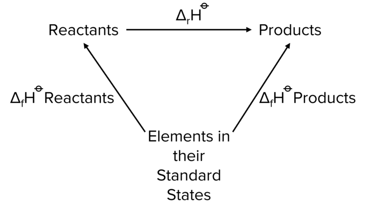 To calculate the enthalpy of the reaction we start at the reactants, then trace a path down through the constituent elements and back up to the products. To do this we move against the enthalpy of formation of the reactants and with the enthalpy of formation of the products.