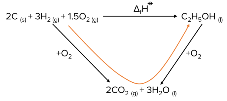 Much like Enthalpies of Formation, it is possible to use standard enthalpies of combustion to construct an alternate path way to calculate reaction enthalpies. In the following example, standard enthalpies of combustion are used to calculate the value of \Delta_{\text{f}}\text{H} of ethanol by the following reaction.