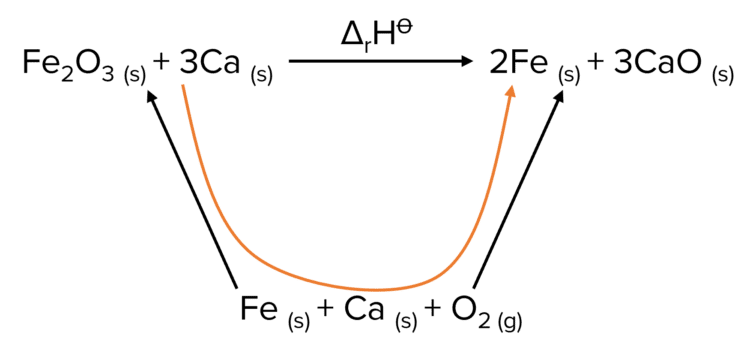 \text{Fe}_2\text{O}_{3\left(\text{s}\right)}+3\text{Ca}_{\left(\text{s}\right)}\rightarrow2\text{Fe}_{\left(\text{s}\right)}+3\text{CaO}_{\left(\text{s}\right)}