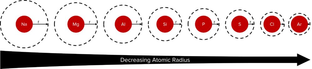 Across a period, going from left to right, the atomic radius decreases. As we go across the period the number of protons found in the each elements nucleus increases. This increases the nuclear charge of the elements, thereby creating a stronger electrostatic attraction between the nucleus and the electrons of the element.