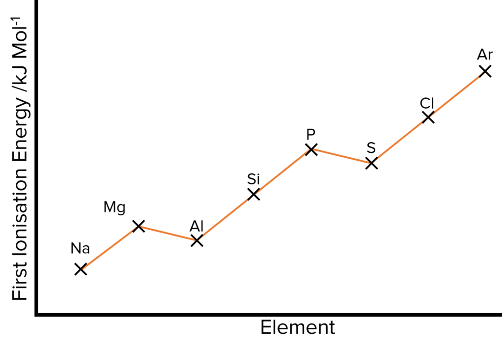 There is also a drop in 1st ionisation energy, between phosphorus \left(\text{P}\right) and sulfur \left(\text{S}\right).
