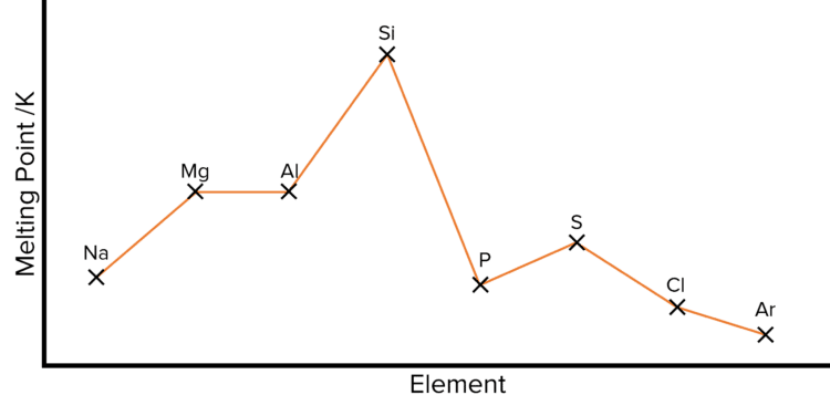 KeyNote: The trends in Period 3 are similar in Period 2, except that while lithium \left(\text{Li}\right) and beryllium \left(\text{Be}\right) are both metals, boron is not a metal and is in fact a macromolecule so will have a very high melting point compared to the metals.
