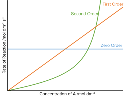 These influence of the reaction order on the rate of reaction can be seen in a when plotting a graph of reaction rate against the concentration of A.