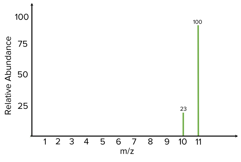 A_{r}=\dfrac{\Sigma\left(\text{isotopic mass}\times\text{relative abundance}\right)}{\text{total relative abundance}}A_{r}=\dfrac{\left(23\times10\right)+\left(100\times11\right)}{100+23}= \dfrac{230+1100}{123}= \dfrac{2330}{123} = 10.81