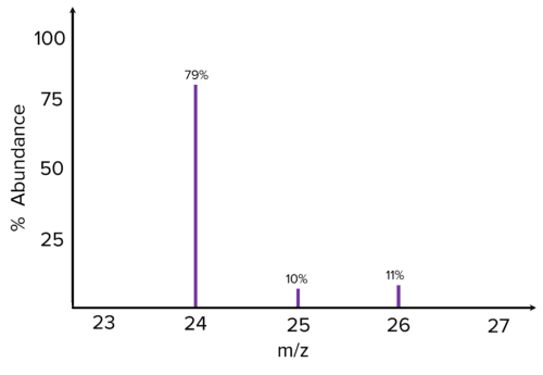 \begin{aligned}A_{r}&= \dfrac{\Sigma\left(\text{isotopic mass}\times\%\text{ abundance}\right)}{100}\\&=\dfrac{\left(24\times79\right)+\left(25\times10\right)+\left(26\times11\right)}{100}\\&= \dfrac{1896+250+286}{100}\\ &= \dfrac{2432}{100} = 24.32\end{aligned}