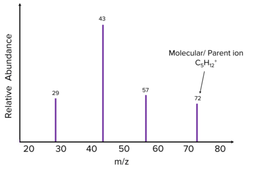 The figure below shows the mass spectra for pentane, by looking at the peak with the biggest m/z value, we can work out that the ion has an Mr of 72.