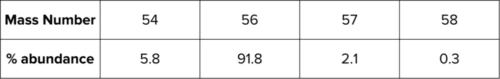 \begin{aligned}A_{r}&=\dfrac{\Sigma\left(\text{isotopic mass}\times\%\text{ abundance}\right)}{100}\\ &=\dfrac{\left(54\times5.8\right)+\left(56\times91.8\right)+\left(57\times2.1\right)+\left(58\times0.3\right)}{100}\\&= \dfrac{313.2+5140.8+119.7+17.4}{100}\\& = \dfrac{5591.1}{100} \\&= 55.91\end{aligned}