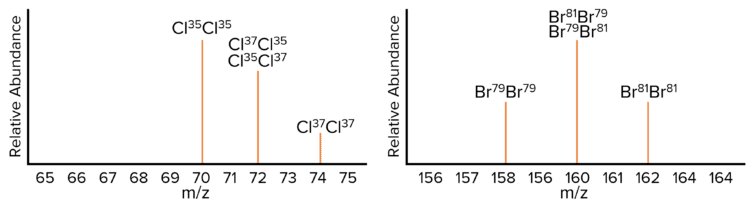 - Bromine: \text{Br}^{79} \left(50\%\right) and \text{Br}^{81} \left(50\%\right)