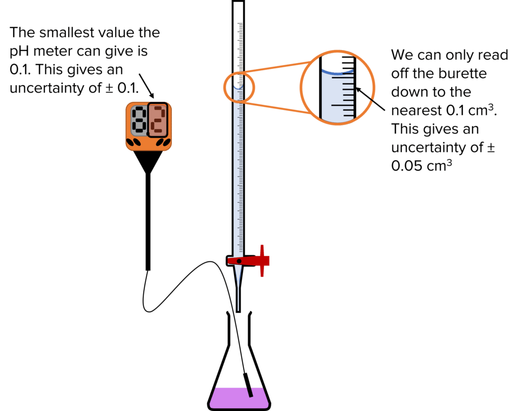 - Burette: \pm 0.15\text{ cm}^3 – This value is three times the uncertainty of the burette. One uncertainty is taken from the 0 reading at the start of the titration. Another is taken from the final reading of the the burette. The third uncertainty is added to account for the fact that it is impossible to add exactly the right amount of titrant to reach the end point (known as end point uncertainty).