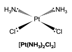 Cisplatin is the cis-isomer of a platinum complex that is commonly used as a treatment for cancer. It consists of ammonia and chloride ligands, with either of the chlorine ligands undergoing ligand substitution in order to treat cancer.