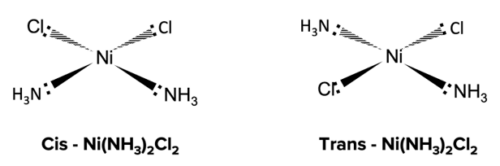 Square planar complexes show cis-trans isomerism when two of the monodentate ligands are the same, while the other two monodentate ligands are different.