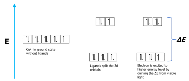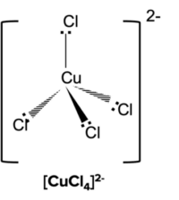 Question 1: Explain why the complex ion formed in an aqueous solution between copper (II) ions and chloride ions is a different colour from the \left[\text{Cu}\left(\text{H}_2\text{O}\right)_6\right]^{2+}.