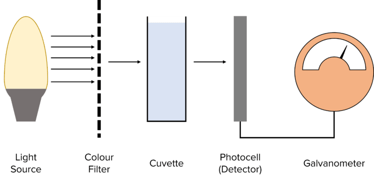 - Measure the amount of light that was absorbed/ transmitted with a colorimeter.