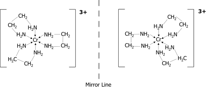 Octahedral complexes display optical isomerism when there are 3 bidentate ligands such as ethane-1,2-diamine \left(\text{NH}_2\text{CH}_2\text{CH}_2\text{NH}_2\right) attached to the central metal ion. The isomers are mirror images which are non-superimposable.