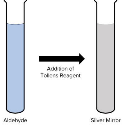 When Tollens’ reagent is added to aldehydes, the aldehyde reduces the silver ion within the complex to silver. This produces a mirrored layer of solid silver around the walls of the reaction vessel.