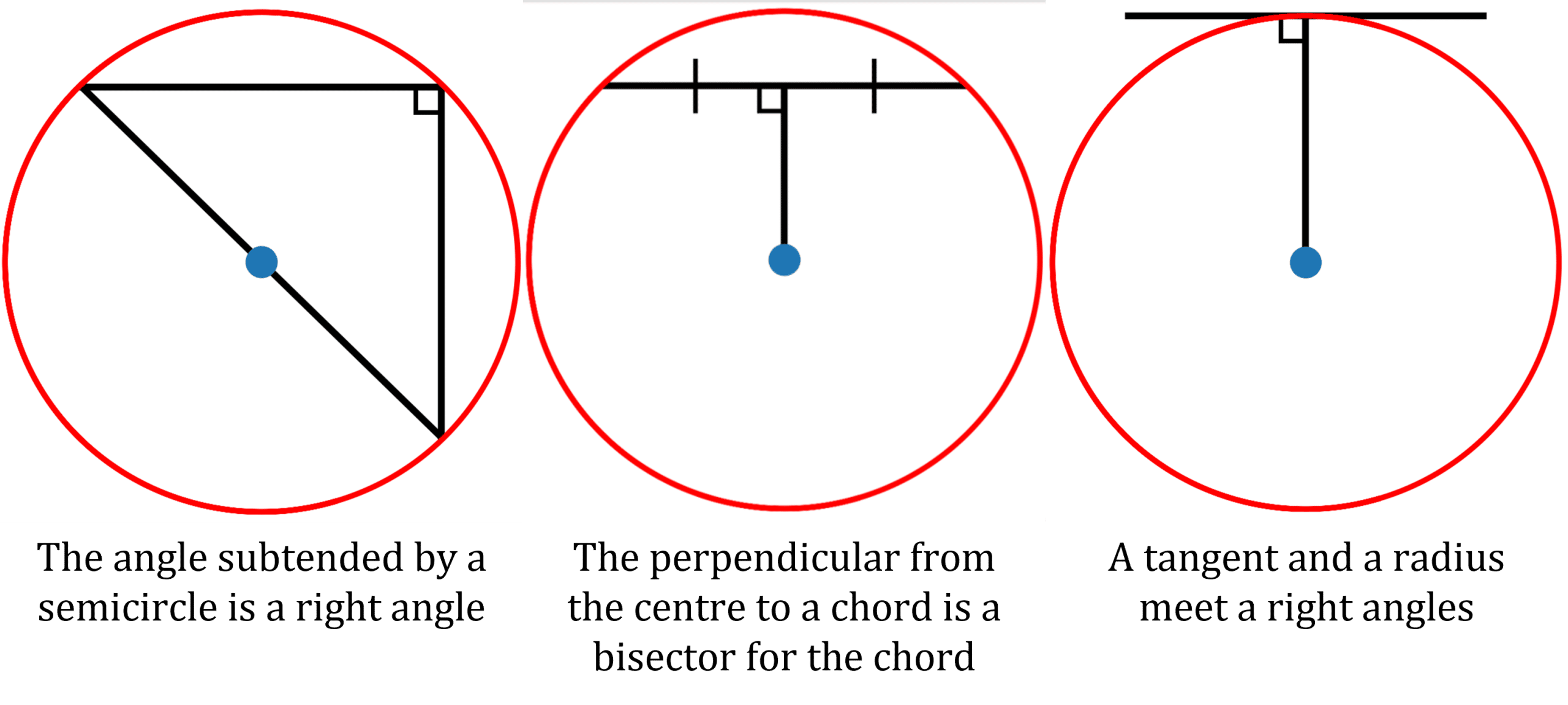 • the radius of a circle at a given point on its circumference is perpendicular to the tangent to the circle at that point