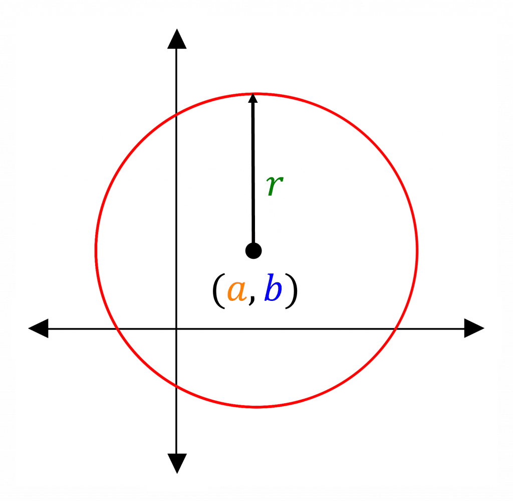 (x-\color{orange}a\color{grey})^{2}+(y-\color{blue}b\color{grey})^{2}=\color{green}r\color{grey}^{2}