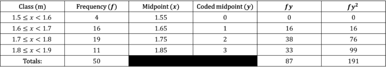 Step 2: Choose a suitable coding for the midpoints. Here we should go for y=\dfrac{x-1.55}{0.1}. Now add the coded midpoints to the table.