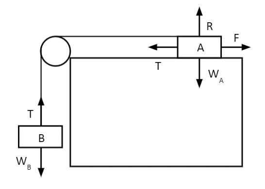 Question 2: For two bricks of mass 4\text{ kg} linked by a rope on a smooth pulley, find the tension in the rope. Assume that the surface that brick \text{A} has a coefficient of friction of 0.7.