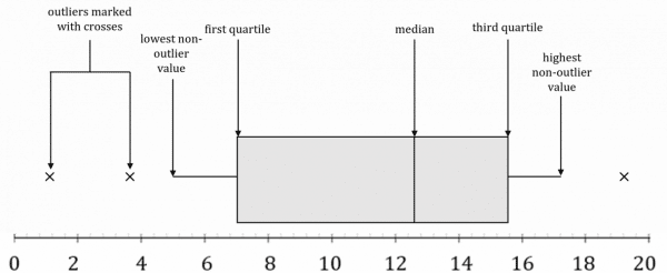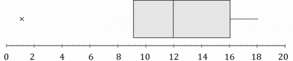 The lowest non-outlier value is 9, and the highest non-outlier value is 18