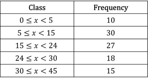 Suppose we have a table showing classes and frequencies, such as for histograms. We can find the cumulative frequency by adding on a column in which we add up the frequencies as we go. To create a cumulative frequency graph, we plot these cumulative frequencies as y values against the top of each class as x values, then join the points up with straight lines.