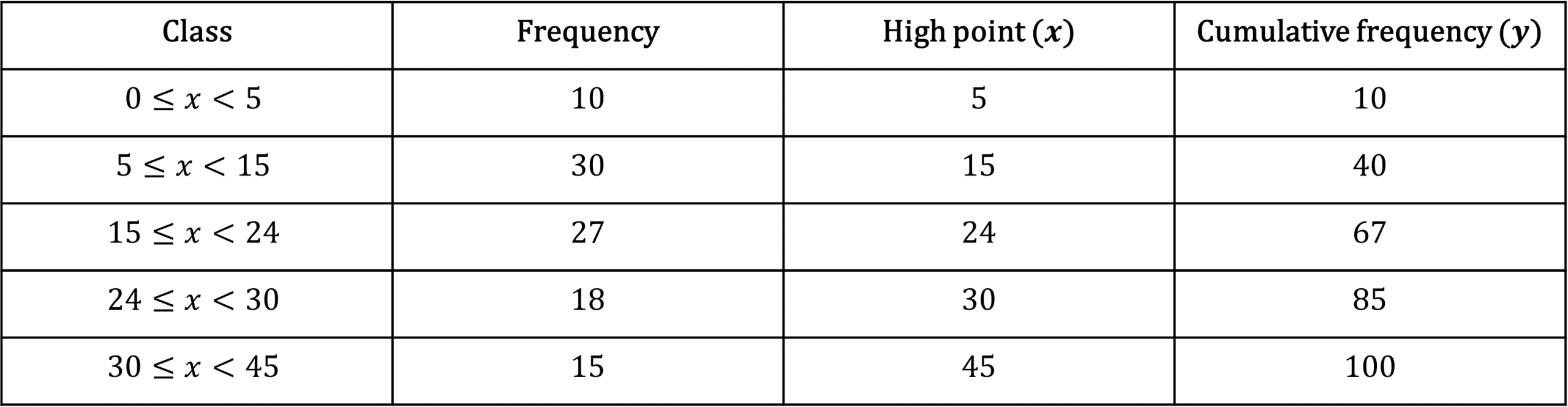 Step 1: Add a high point column and cumulative frequency column to the table.