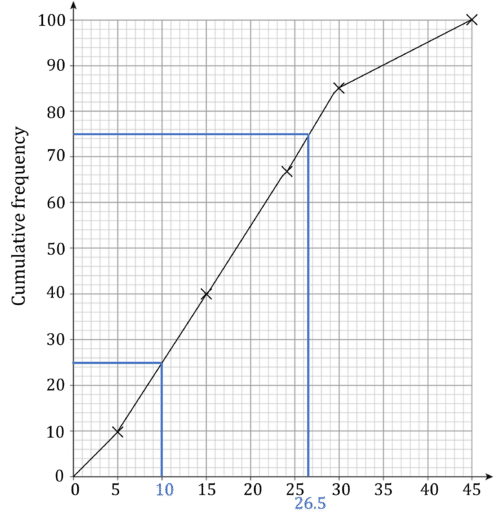 Step 3: Draw lines at cumulative frequencies of 25 (first quartile) and 75 (third quartile) and read off the x values.