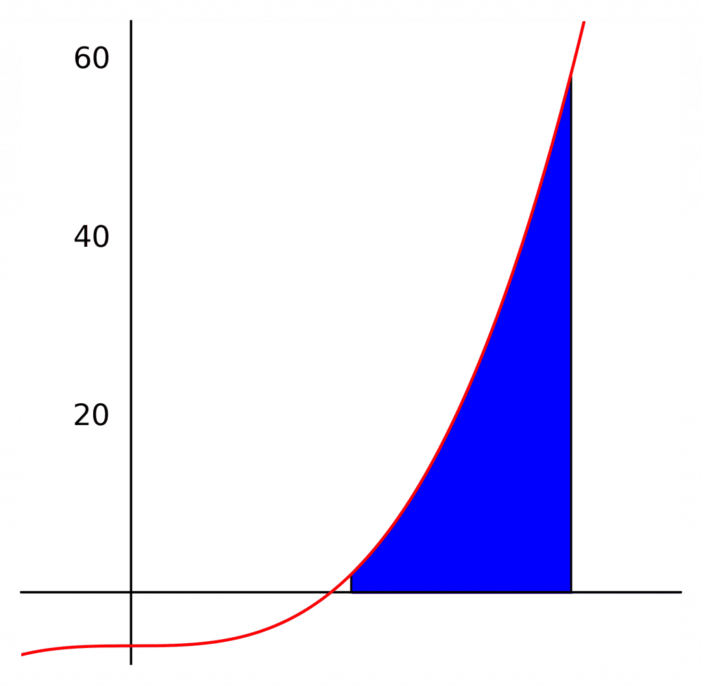 Definite integrals represent the area under the graph. For example, to find the area under the graph between -2 and 2 of y=x^{2}-4, we would do \int^{2}_{-2}x^{2}-4dx.