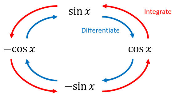 Below is a diagram showing the derivative and integral of the basic trigonometric functions, \sin x and \cos x.
