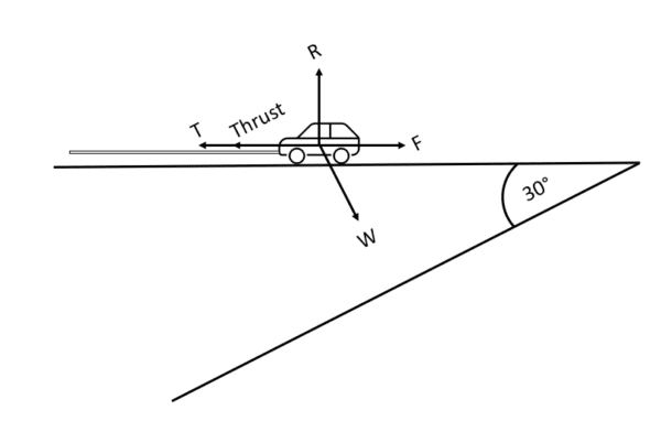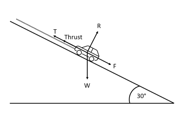 You’ll notice that the reaction force, R, is no longer acting vertically. However, it is perpendicular to the thrust, tension and friction, so it has no effect on how the car moves up the plane.
