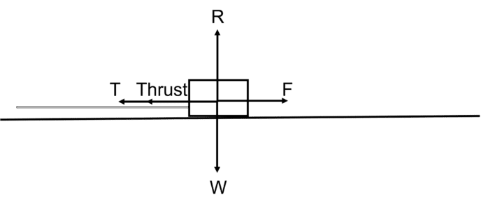 Let’s now say that the weight of the box, W, is 100\text{ N}, and that the friction is limiting (i.e. applying any more force in T or Thrust will cause the box to accelerate). Say, also, that the friction F is 50\text{ N}.