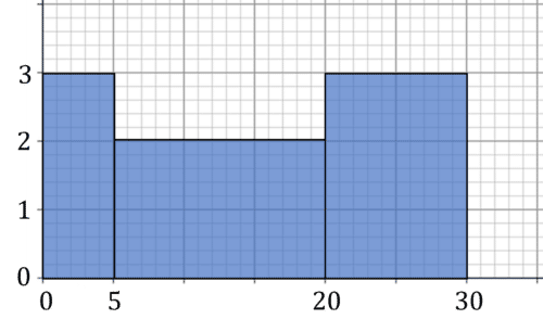 a) A line at 15 would split the second block. To the right of 15 in this block is a width of 5 and a height of 28, for a total of 5\times 28=140 frequency. The third block has a width of 10 and a height of 12, for a total of 10\times 12=120 frequency. Overall, the number of values greater than 15 is 140+120=260