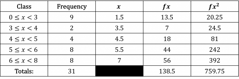\begin{aligned}\text{mean}&=\dfrac{\sum{fx}}{\sum{f}}\\[1.2em]&=\dfrac{138.5}{31}=4.47\\[1.2em]\text{variance}&=\dfrac{\sum{fx^{2}}}{\sum{f}}-\text{mean}^{2}\\[1.2em]&=\dfrac{759.75}{31}-4.47^{2}\\[1.2em]&=4.55\\[1.2em]\text{standard deviation}&=\sqrt{\text{variance}}\\[1.2em]&=\sqrt{4.55}\\[1.2em]&=2.13\end{aligned}