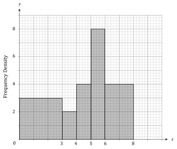 There are 31 data points, so the median is the 15.5th data point. We can treat the decimal like it is a whole number position for our estimate. There are 15 data points in the first two blocks, so this falls 0.5 data points into the third block. Said block contains 8 data points and has a width of 1. So we are \dfrac{1\times 0.5}{8}=0.0625, so we are 0.0625 into the block. The block starts at 5, so the median is 5.0625.