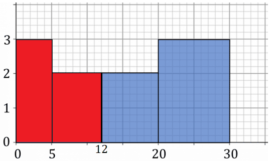 Draw a line at 12 on the x axis. This will split the second block. Then, the area of the graph to the right of the line is our estimate. In this case, the second block now extends from 12 to 20, with a height of 2, so a frequency of 2\times 8=16 comes from the second block. The third block has a length of 10 and a height of 3, so gives 30 frequency. In total, there are 16+30=46 values larger than 12.