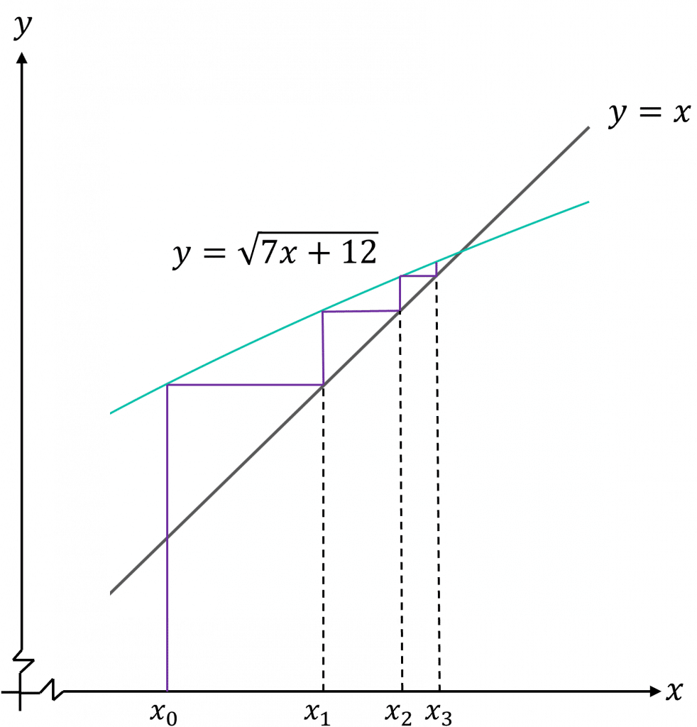 7x-x^2+12=0 can be rearranged to give the iteration formula: x_n=\sqrt{7x+12}