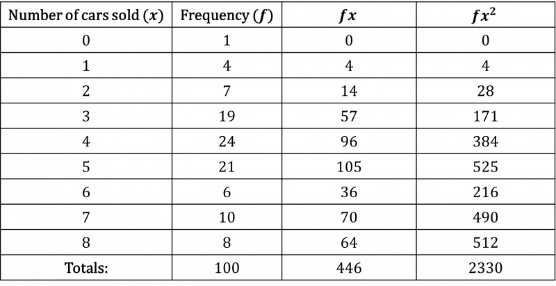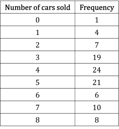 The number of cars sold by 100 small used car dealerships was monitored over the course of a day. The results have been collated into a table.