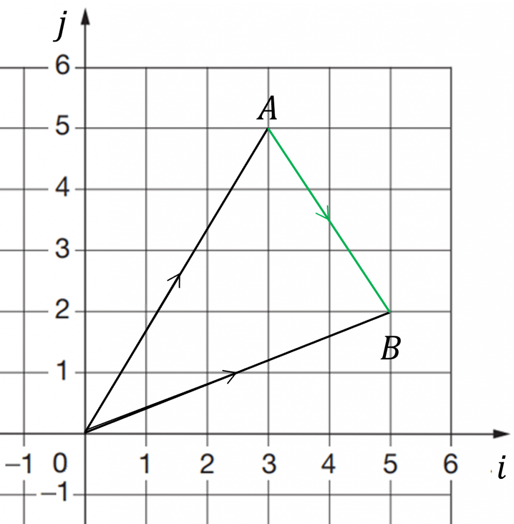 Using the diagram on the right, we can see the position vector of point A=3\boldsymbol{i}+5\boldsymbol{j} and the position vector of point B=5\boldsymbol{i}+2\boldsymbol{j}