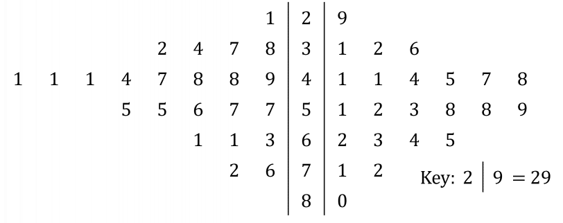 Stem and leaf diagrams are another way of representing data. It allows raw data to be listed in a space efficient way. The single digit behind the line represents tens (or hundreds, etc) and the digits after the line represent all the units for that tens that are in the data set. For example, 2|3\;4\;5 means 23, 24 and 25 are in the data set.