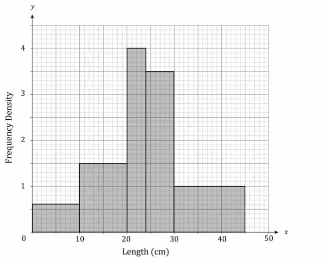A histogram looks like a bar chart, except the columns can be different widths, and we plot frequency density instead of frequency. In histograms, the area of each rectangle tells you the frequency of the data class, with the width of rectangles usually indicating the size of the data class they represent. This gives a formula: