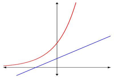 The graph below shows y against x in red and \log(y) against x in blue. As expected, the blue line is straight.